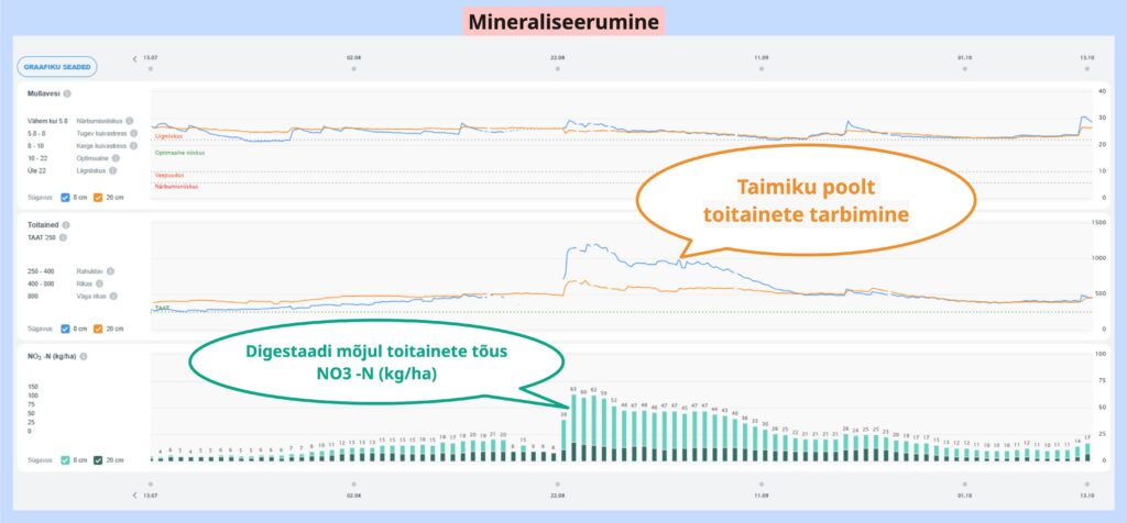 Augusti keskpaigaks oli mineraliseerumise käigus mullas juba umbes 20 kg/ha nitraatlämmastikku. Pärast digestaadi andmist ja külvi näitasid mullajaama andurid toitainete kiiret tõusu ülemises 8 cm mullakihis – just seal, kus noored taimed neid vajavad. 20 cm sügavusele jõudis väetist vaid vähesel määral.