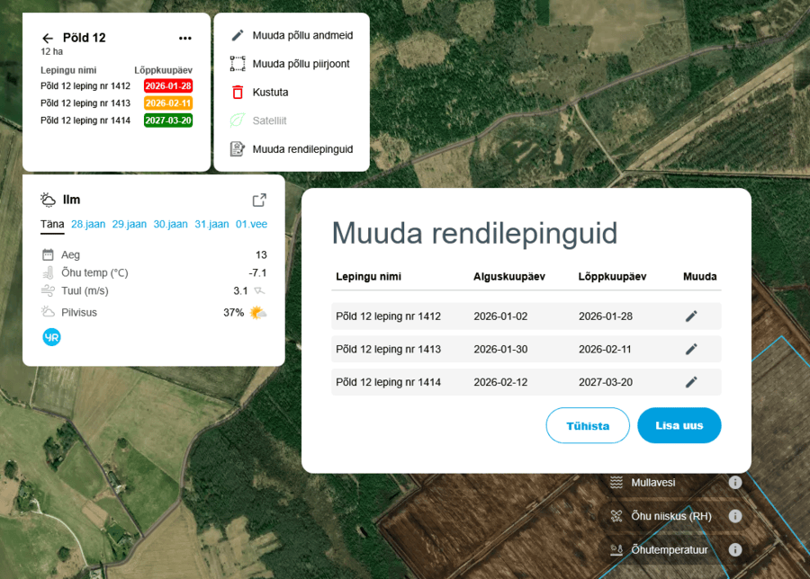 Rendilepingute info lisatakse otse konkreetse põllu juurde. Kui valid kaardil põllu ja avad põlluinfo akna, leiad menüüst valiku „Muuda rendilepinguid“.
