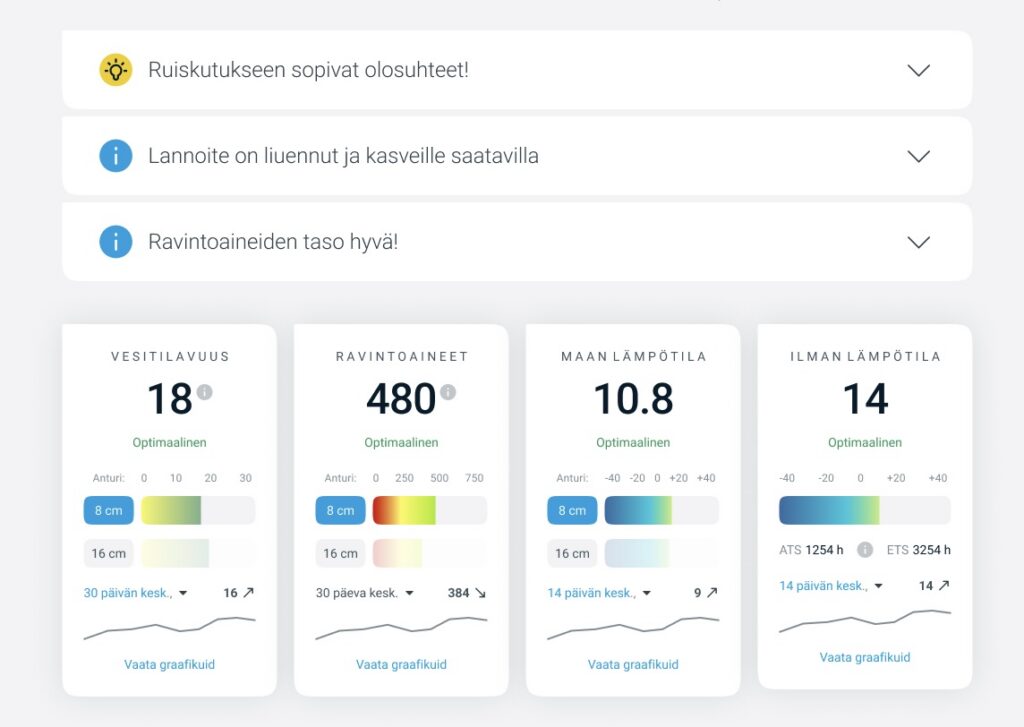Paul-Techi hallintapaneelin yksityiskohtaisessa näkymässä esitettävät suositukset auttavat tulkitsemaan mittaustietoja ja tekemään päivittäisiä päätöksiä oikeaan aikaan. Ne eivät näytä pelkästään mitattuja arvoja, vaan antavat selkeän vihjeen siitä, milloin peltotyöt ovat tehokkaita ja milloin on parempi odottaa.