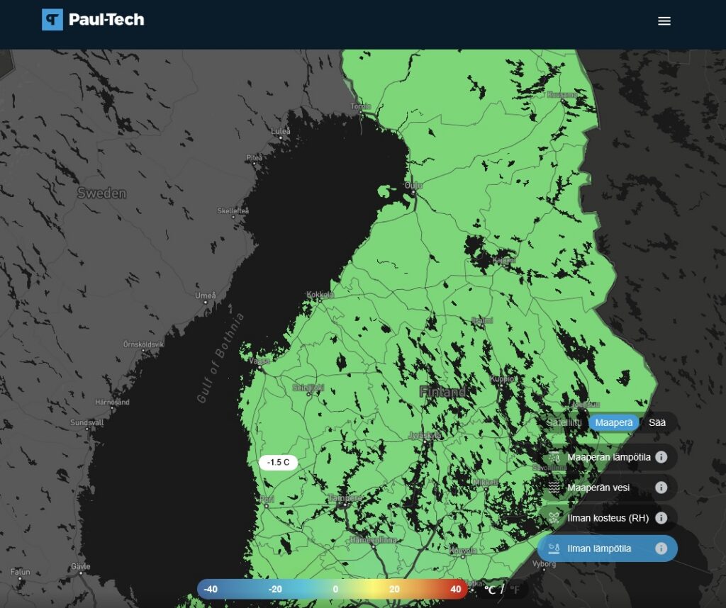 Ilman lämpötila on yksi tärkeimmistä ja samalla myös vaihtelevimmista tekijöistä, jotka vaikuttavat päivittäin pellolla tapahtuviin ilmiöihin. Juuri lämpötilasta riippuu, alkaako kasvi kasvaa, pysähtyykö sen kehitys, joutuuko se stressiin tai onko se vaarassa vaurioitua hallan seurauksena. Paul-Techi ilman lämpötilakartta kokoaa eri puolille Viroa sijoitettujen asemien reaaliaikaiset mittaukset ja tarjoaa nopean yleiskuvan alueellisista olosuhteista sekä tukee peltotöiden oikeaa ajoittamista.