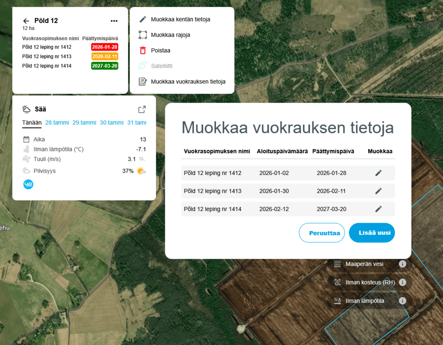 Paul-Tech mahdollistaa peltojen vuokrasopimusten määräaikojen hallinnan ja seurannan suoraan karttanäkymässä. Kun vuokrasopimuksen alku- ja päättymispäivämäärät syötetään järjestelmään, sopimuksen tila näkyy peltokohtaisesti ja järjestelmä lähettää muistutuksia määräajan lähestyessä.