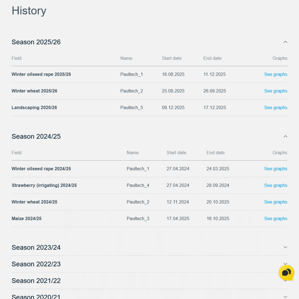 „Paul-Tech“ Istorijos vaizdas sujungia visus ankstesnius sezonus vienoje vietoje, todėl konkretaus sezono ir lauko duomenis galima pasiekti greitai ir patogiai. Kiekvienas sezonas yra aiškiai atskirtas ir gali būti atidaromas atskirai, todėl net ir kelių metų duomenys išlieka tvarkingi ir lengvai suprantami.