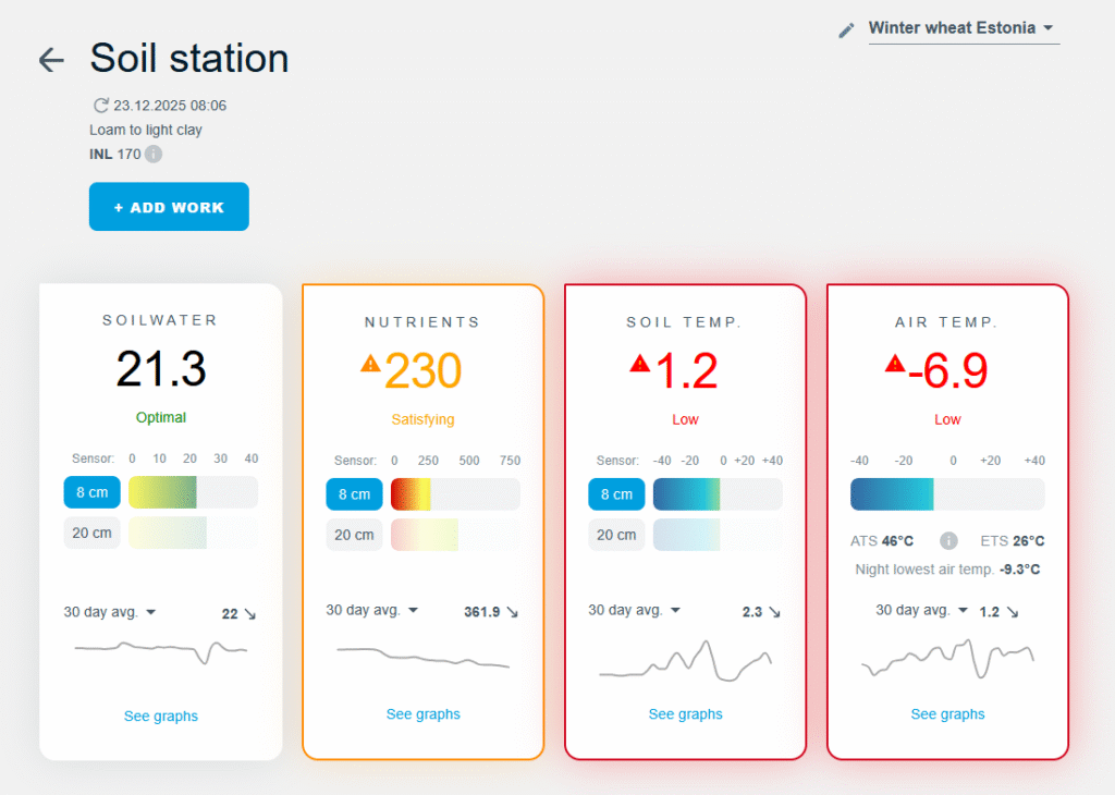 Po rekomendacijomis pateikiami pagrindiniai lauko aplinkos rodikliai atskirose kortelėse: dirvožemio drėgmė, maistinės medžiagos, dirvožemio temperatūra ir oro temperatūra. Kiekviena kortelė suteikia greitą vizualinį esamos situacijos įvertinimą. Spalvinis žymėjimas leidžia iš karto suprasti, ar rodikliai yra optimalūs, priimtini ar kritiniai. Jei kuris nors rodiklis viršija normos ribas, visa kortelė paryškinama atitinkama spalva, kad pokytis neliktų nepastebėtas.