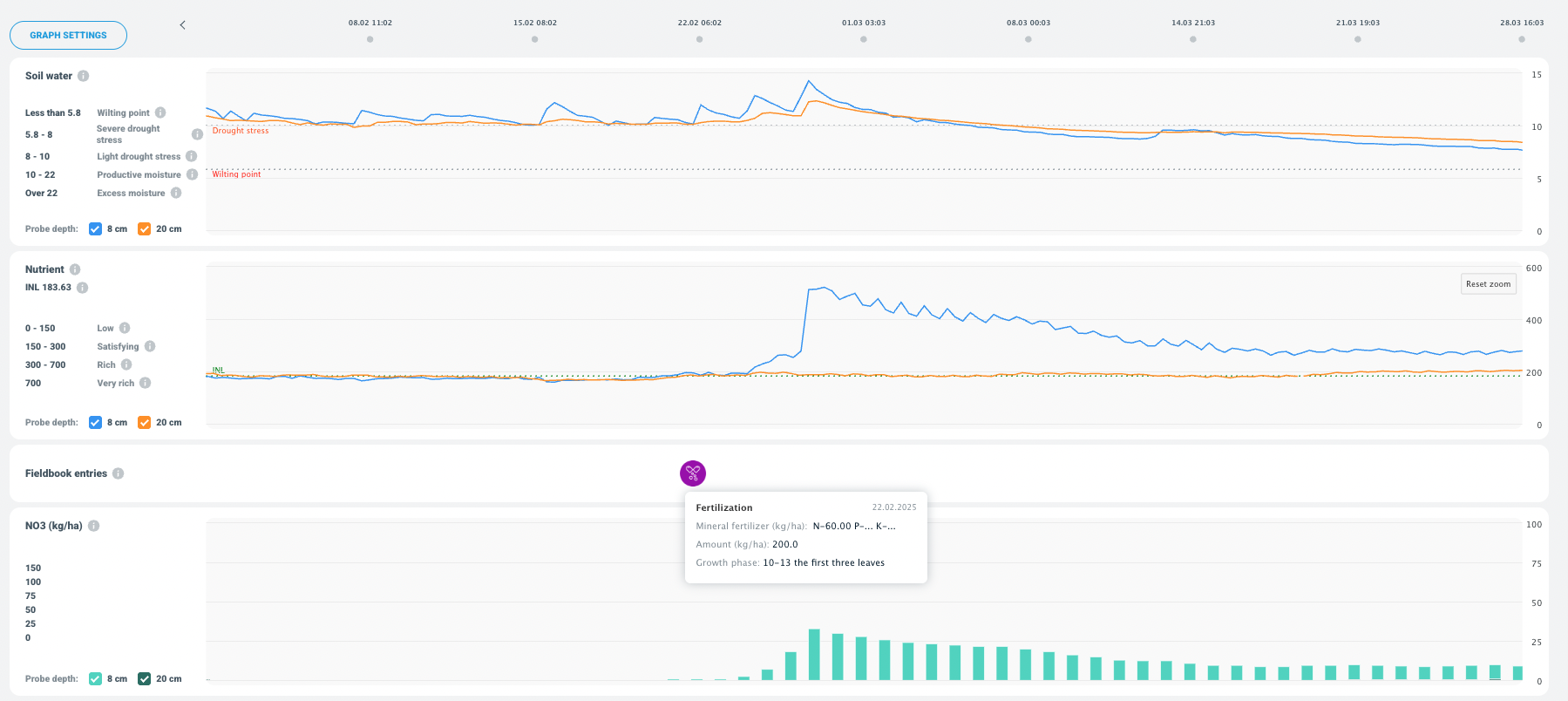 The greatest value of the graph view lies not in individual readings, but in making relationships visible. When field operations have been carried out or weather conditions have changed, the graphs allow users to see how and when these changes are actually reflected in the soil.