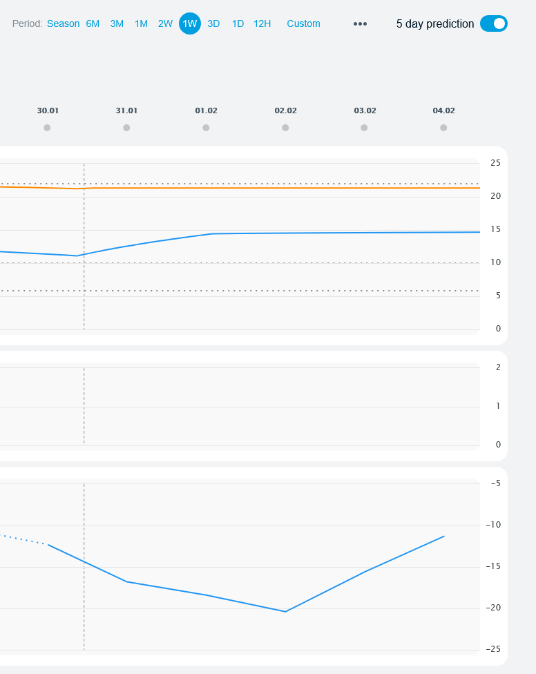 The 5-day forecast added to the graphs gives an indication of how forecasted weather conditions may affect soil conditions in the near future. It is not simply a weather forecast or a direct action recommendation, but a tool that helps to understand possible developments and identify risks early.