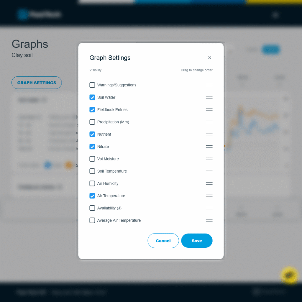Users can choose which graphs to display and in what order. This allows them to focus on the information that matters most at any given moment – whether that’s soil water, nutrient dynamics, rainfall, or temperatures.