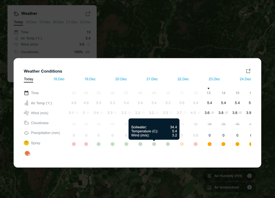 Hovering over the spray suitability indicator displays more detailed information about which factors are influencing the assessment – for example, whether limitations are caused by wind conditions, temperature or soil status. This means the user does not need to combine all indicators manually; the system provides a quick signal on whether to proceed or wait.