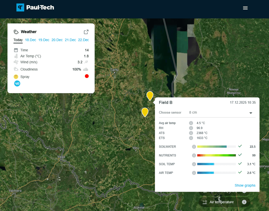 In the map view, each field has its own marker. Clicking on it opens more detailed information about that specific field. This removes the need to rely on general weather forecasts and allows users to see the conditions exactly where the work is being carried out. In the opened view, station-measured data and the weather forecast are displayed separately, together helping to better understand both the current situation and what lies ahead.