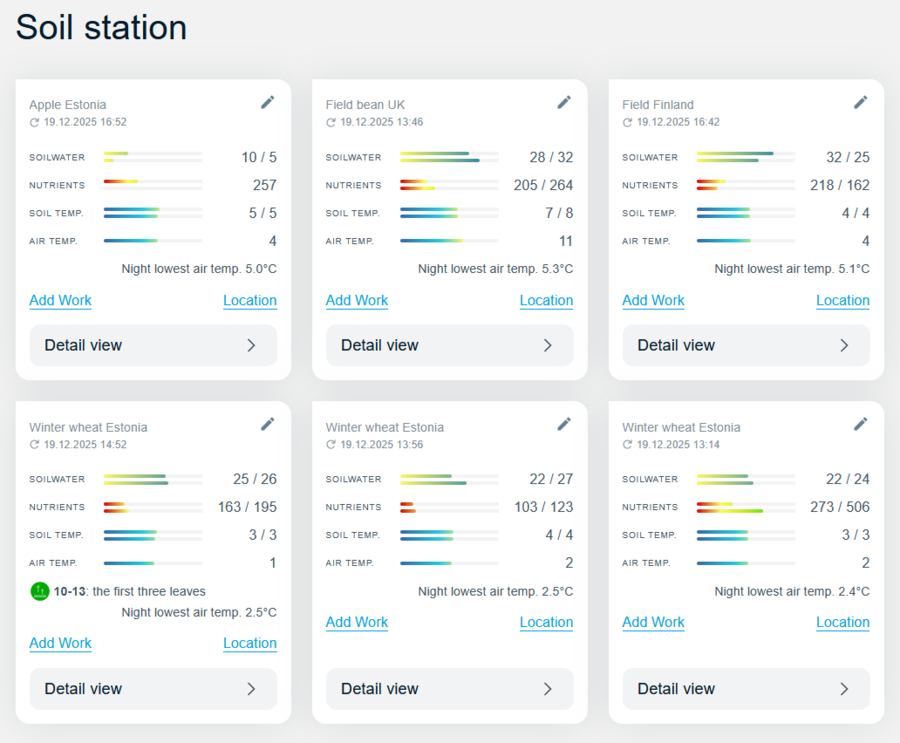 To make data interpretation fast and intuitive, each parameter is supported by a visual colour scale. This provides an immediate indication of whether conditions are favourable for crop growth or whether a limiting factor may be emerging. Thanks to this visual approach, important changes in field conditions can be identified quickly, without the need to analyse individual numbers in detail.