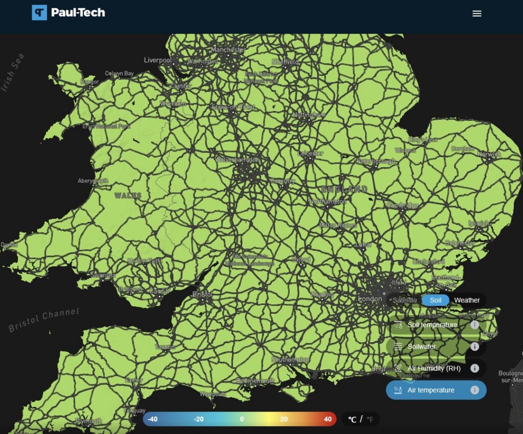 For most arable crops, a favourable air temperature range for growth is approximately 10–20 °C, which can be clearly monitored across regions using the map. This information helps assess whether conditions are suitable for field operations such as fertiliser application or spraying.
